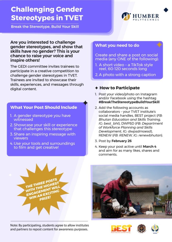 This competition is open exclusively to current trainees of the institute. All eligible trainees are invited to participate by showcasing their skills through a video or photo post. Use #BreakTheStereotypeBuildYourSkill and contribute to promoting positive change in TVET.